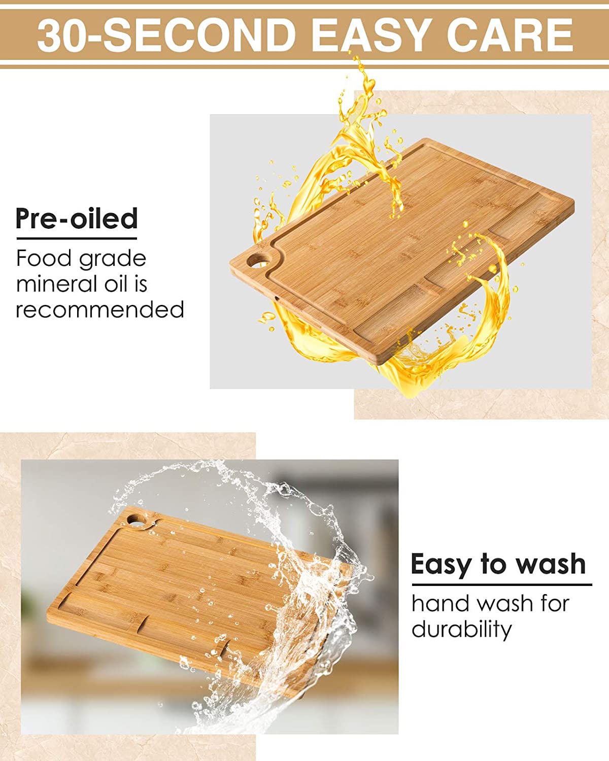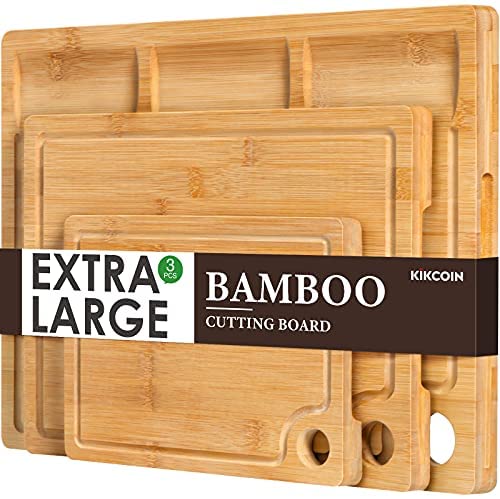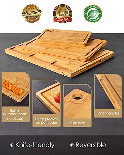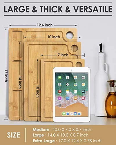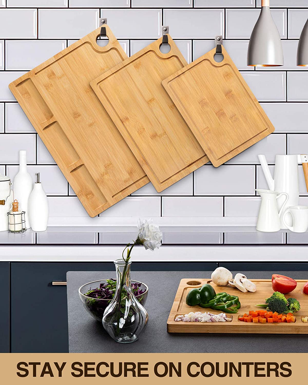 Tabla de cortar de bambú para cocina, juego de 3 tablas de cortar de cocina con 3 compartimentos integrados y ranura para jugo resistente bandeja para servir madera bloque de carnicero y tabla de tallado de madera con agujero